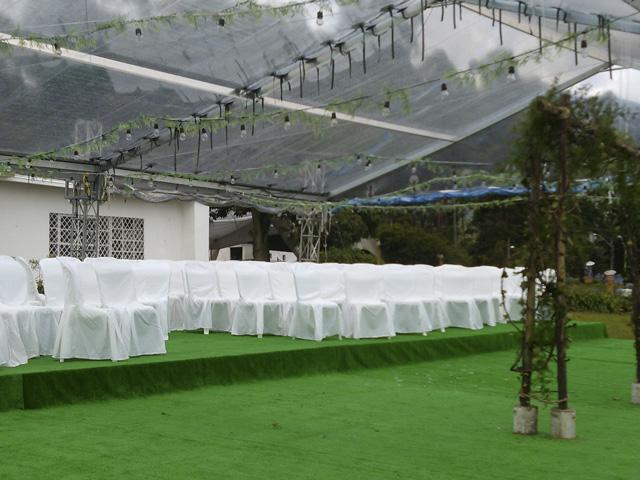 Carpa transparente y piso en gramilla